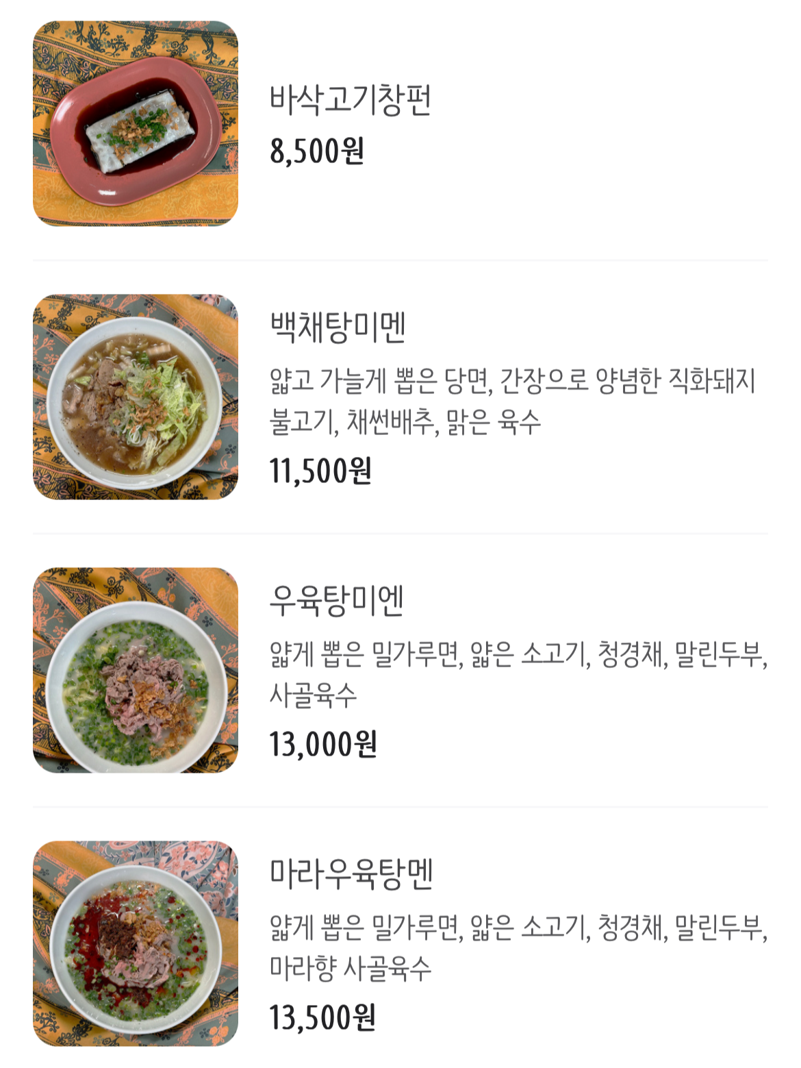 특별한 것은 모르겠지만 세 가지 중 우육탕미엔이 제일 좋았다