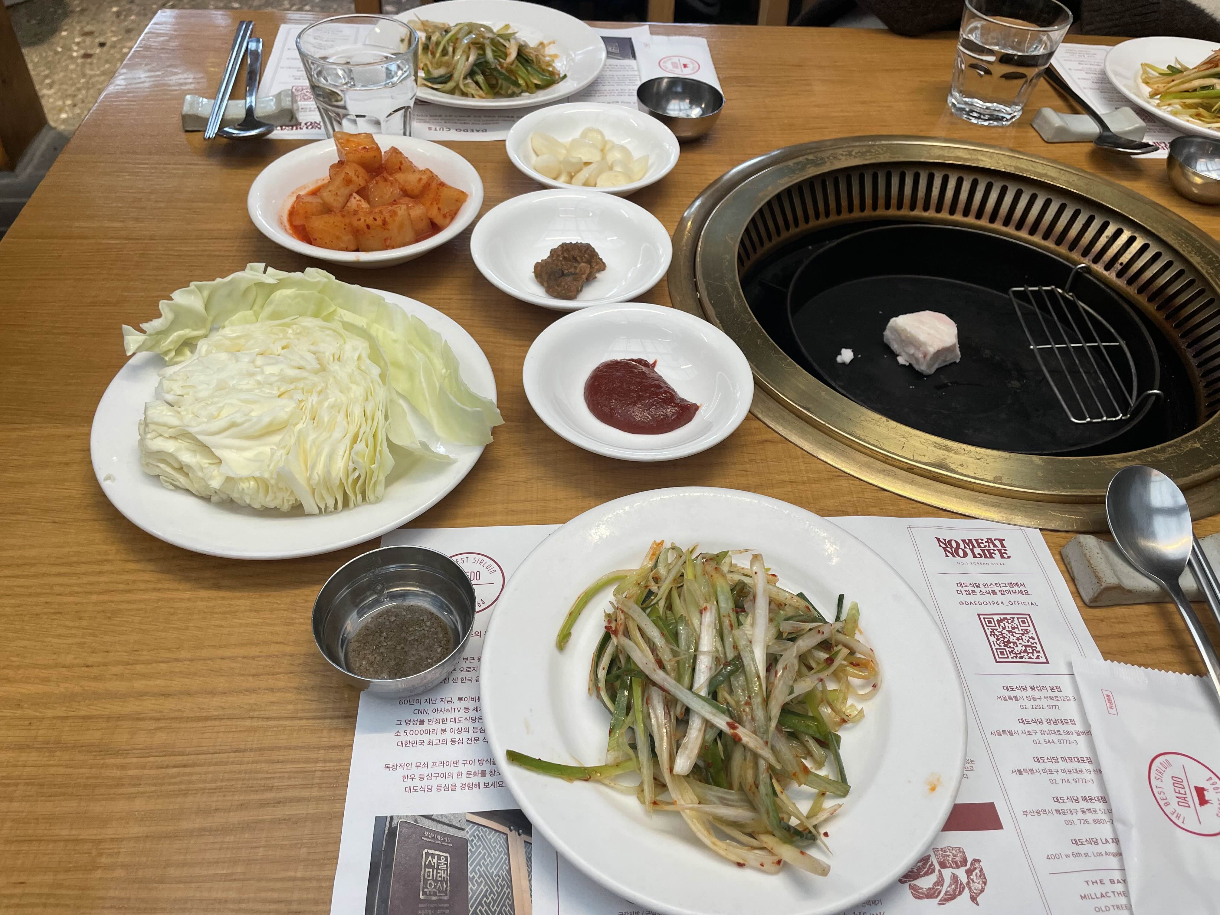 안쪽에 자리 잡고 3인분 주문 후 기본 반찬 세팅 완료