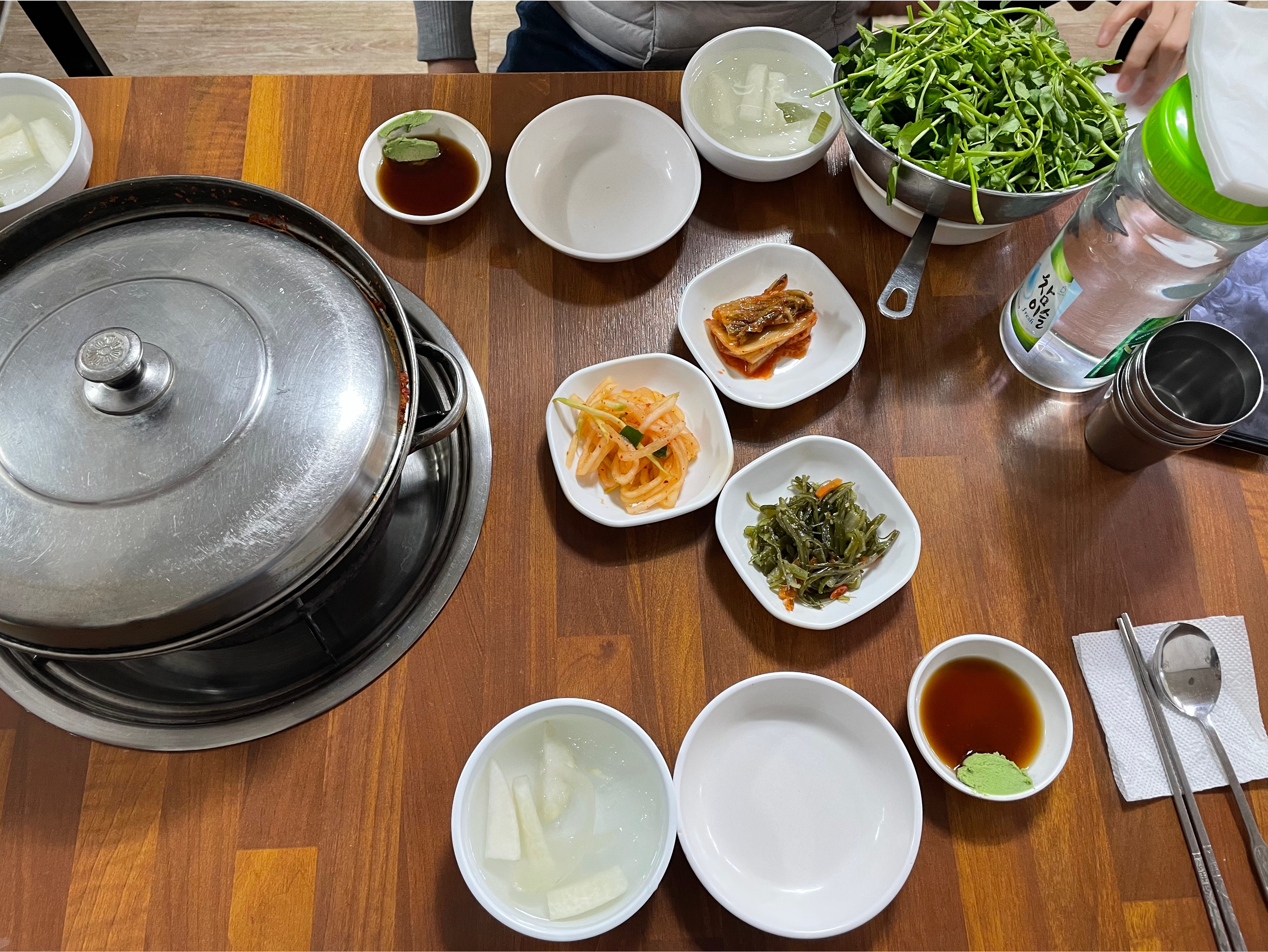 밑반찬은 요렇게 네 가지, 김치 짱! 무채와 동치미 시원, 미역줄기 쏘쏘