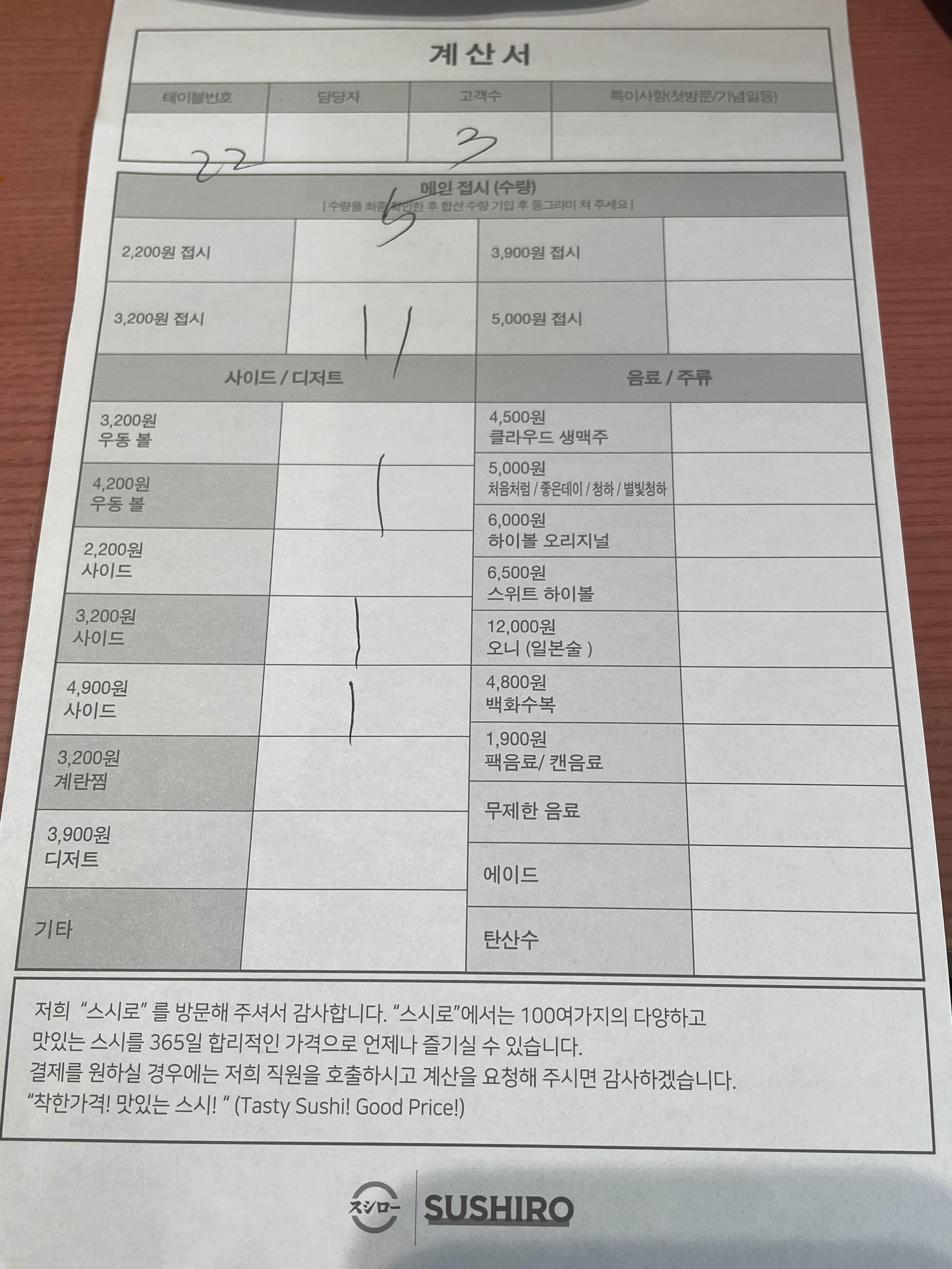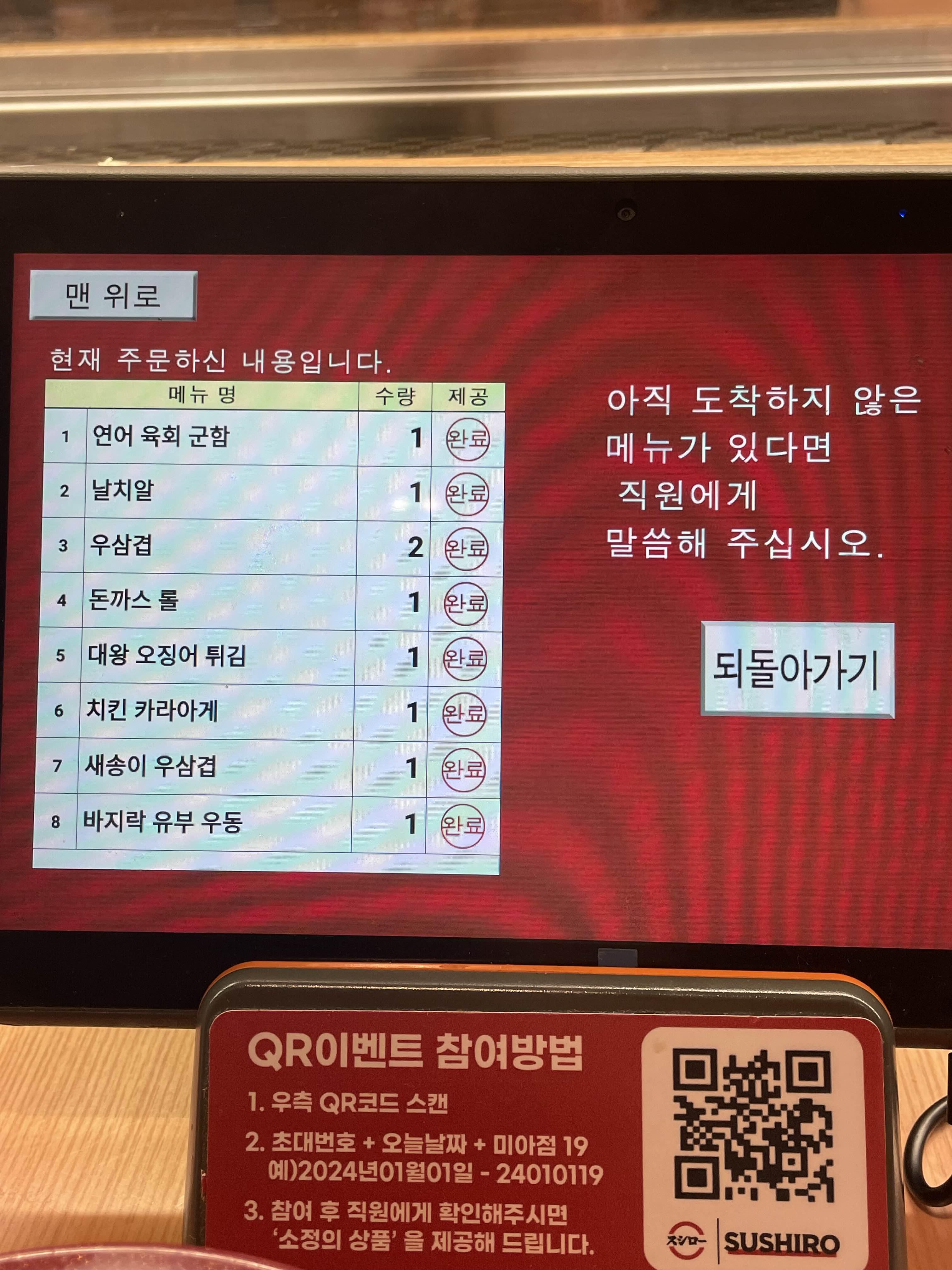 메뉴도 맘에 들어 웨이팅 대기 걸고 기다림....앞 2팀 있었고 내부 빈 좌석 있었으나 아무리 기다려도 호출을 안 해주시더니.. 웨이팅 없이 그냥 입장하는 손님을 받고 있는 걸 목격해 버림.. 어머.. 놔… 항의할까 하다 관두자하고 옆 스시로에 감 <꼭 개선하길 바람!!>