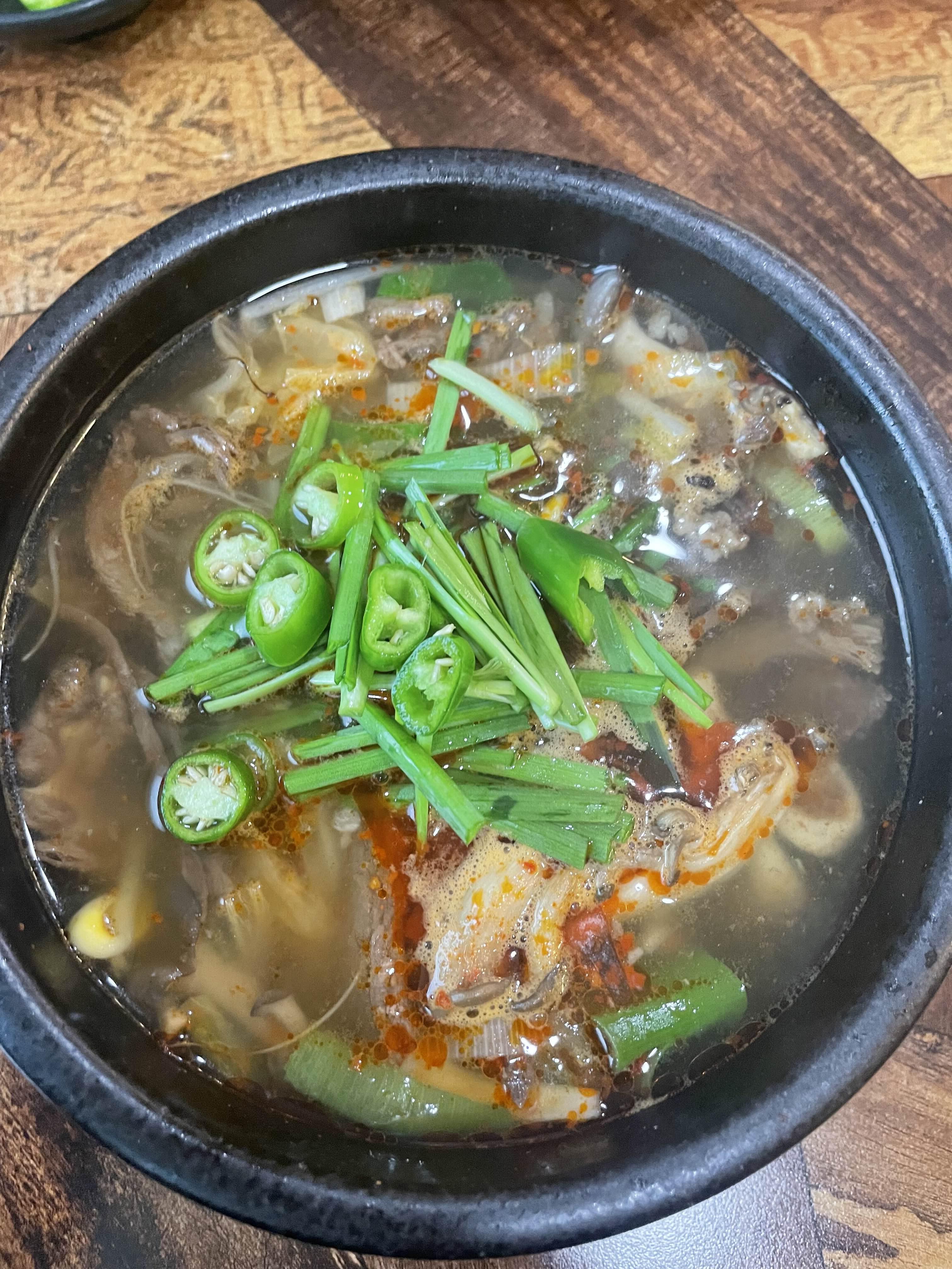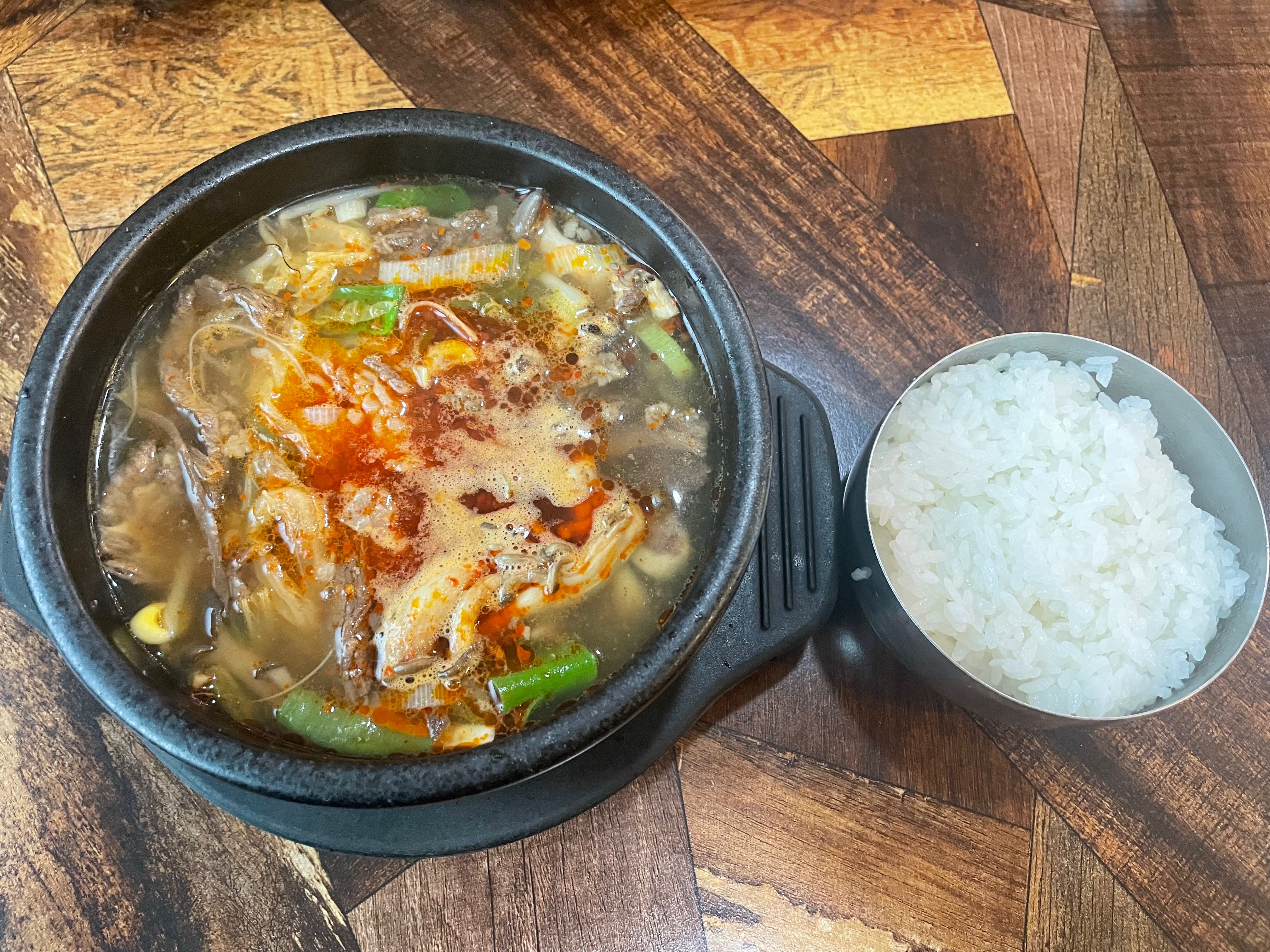 부추와 청양고추를 넣고 소고기 콩나물 부추를 얹어 먹으니 매코롬하니 입에 넣는 순간 진한 국물맛이 일품이었다 어쩜 이리도 고기가 부드럽고 찰지게 맛있는지 밥 없이 건더기만 건져먹어도 짜지 않고 최고였다 흰쌀밥은 반공기만 ^^ 재방문 의사 백퍼~ ❤️❤️